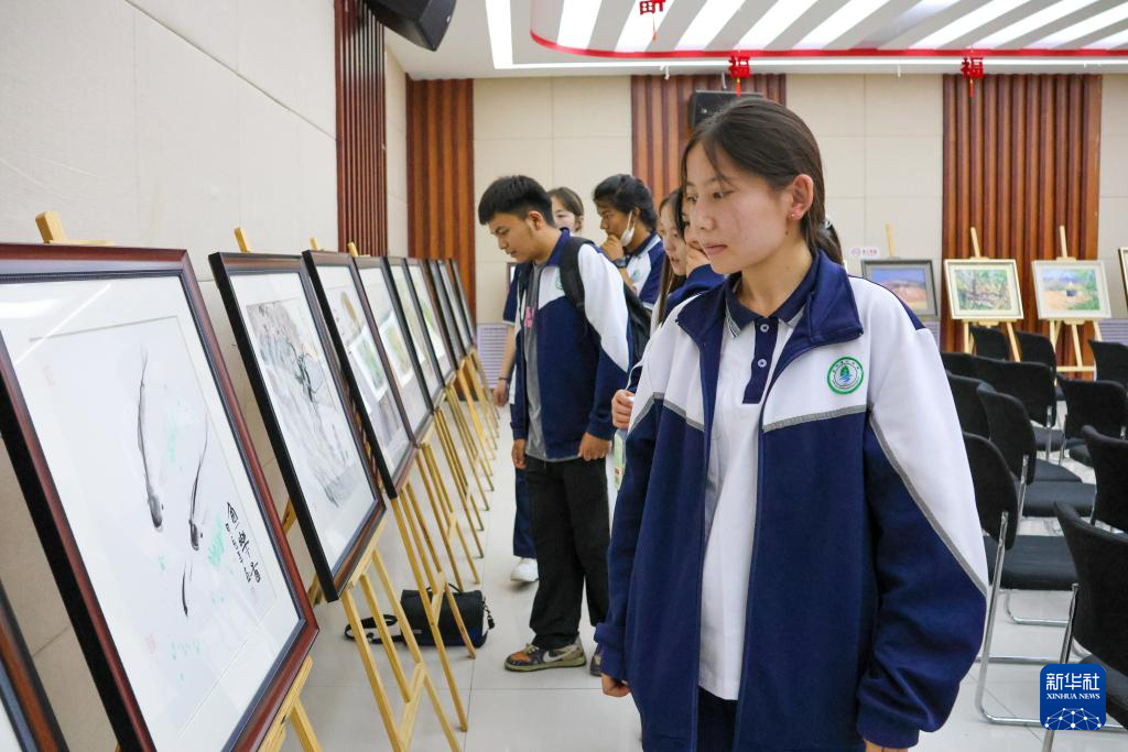 7月7日,在新疆克州阿圖什市新時代文明實踐中心,學生參觀作品展覽。