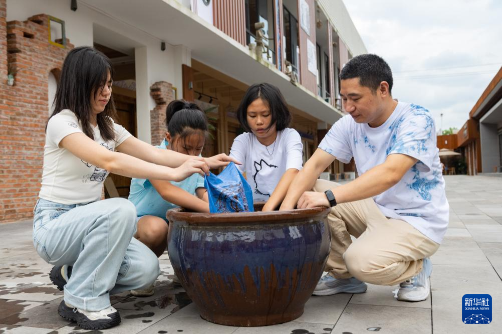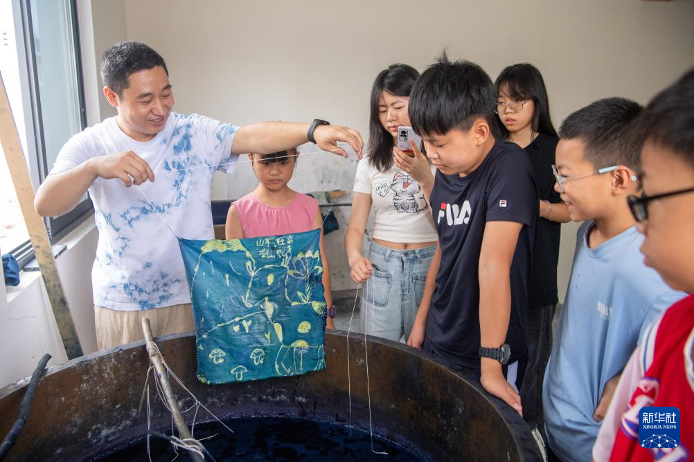 7月10日,在重慶市秀山縣的非遺文創街蠟染館內,蠟染傳承人劉春林(左二)在向青少年傳授染色技巧。