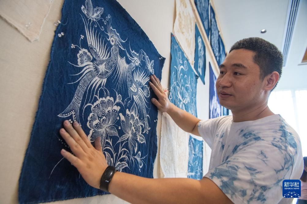 7月10日,在重慶市秀山縣的非遺文創街蠟染館內,蠟染傳承人劉春林展示蠟染作品。