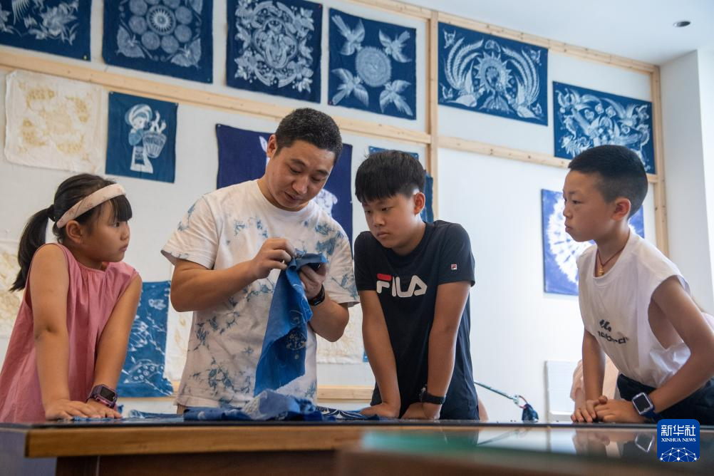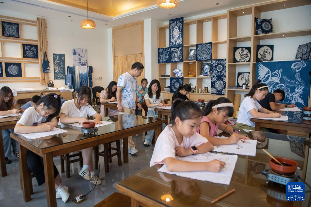 7月10日,在重慶市秀山縣的非遺文創街蠟染館內,青少年在蠟染傳承人的指導下體驗蠟染技藝。