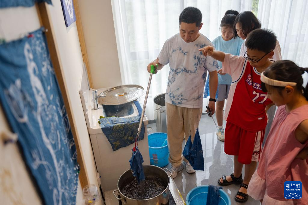 7月10日,在重慶市秀山縣的非遺文創街蠟染館內,蠟染傳承人劉春林(右一)在向青少年傳授染色技巧。