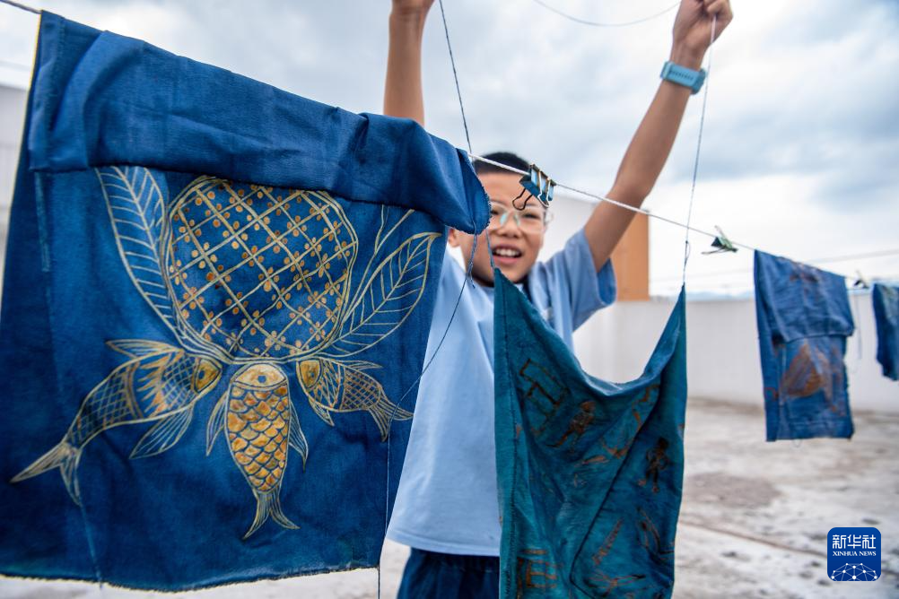 7月10日,在重慶市秀山縣的非遺文創街蠟染館內,小朋友晾曬染色的蠟染作品。
