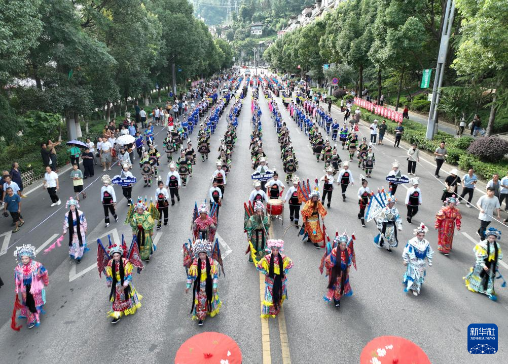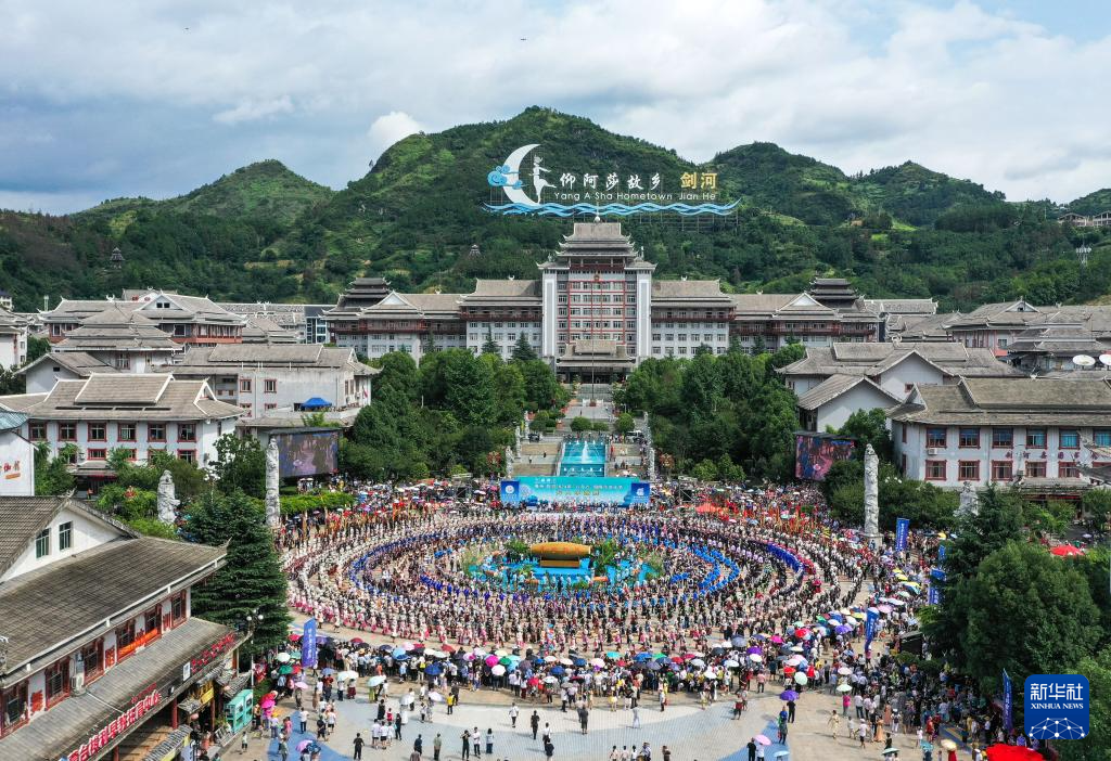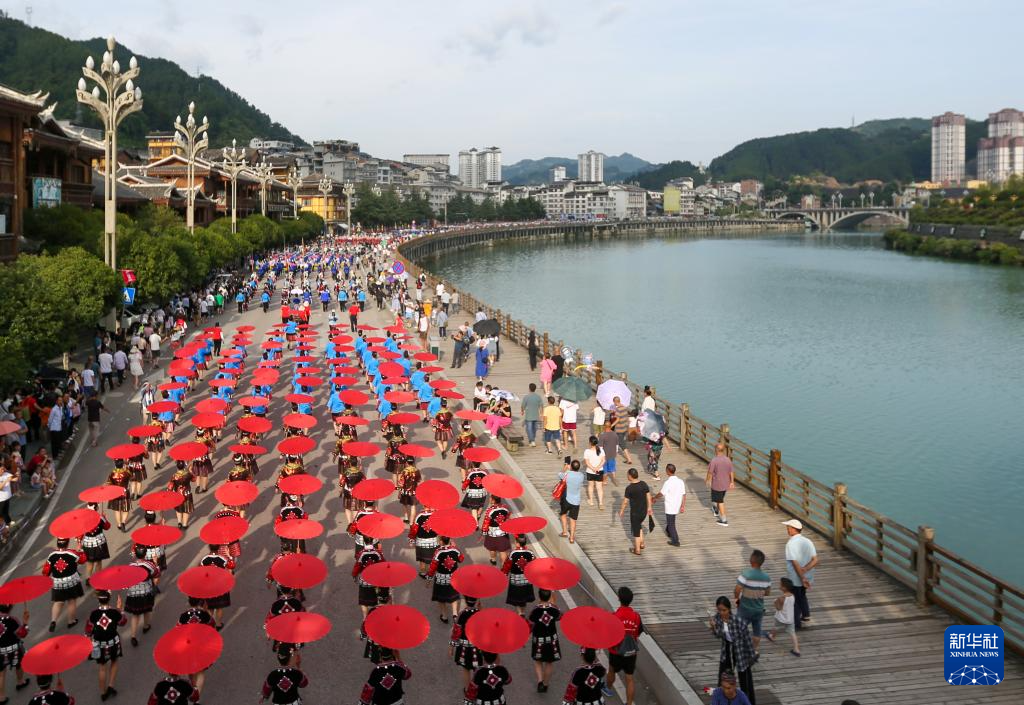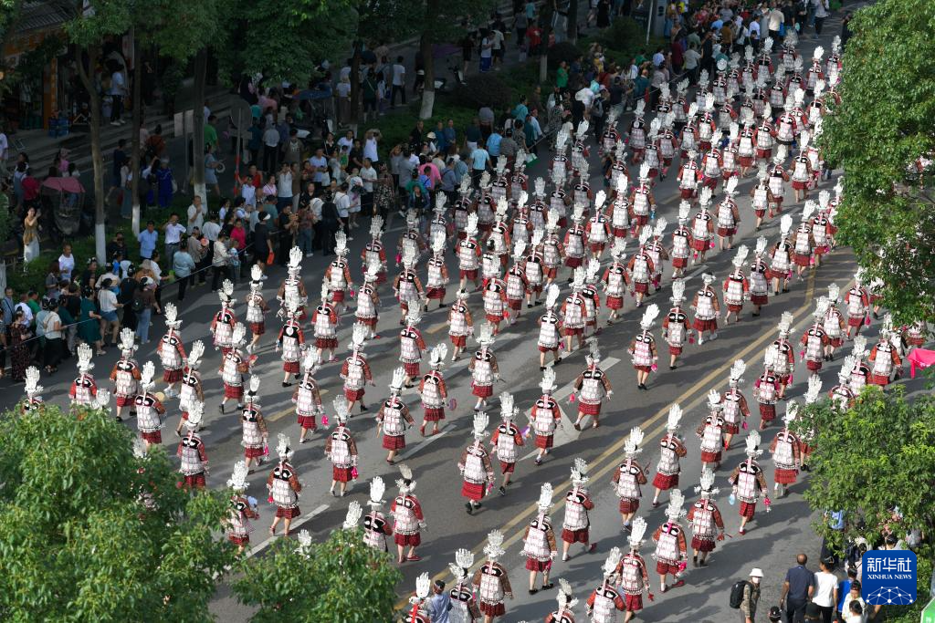 7月13日,少數民族群眾在參加貴州劍河仰阿莎文化節水鼓舞展演(無人機照片)。
