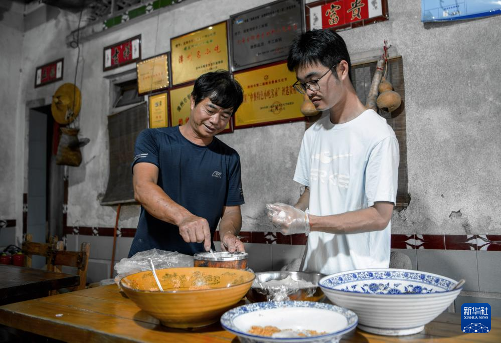 這是埭美村村民陳志平(右)跟父親一起制作麻糍(7月10日攝)。2016年,大學畢業的他返鄉創業,接手家傳手藝,同時還致力于鄉土文化的宣傳。