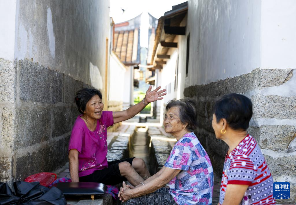 埭美村村民在古厝間乘涼聊天(7月10日攝)。