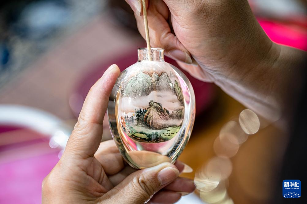 內畫是我國特有的傳統工藝。畫師把特制的畫筆,伸入狹窄的瓶口反向繪畫,將大千世界鑲嵌于方寸之間?!暗崤蓛犬嫛笔乾F代內畫技藝中一種獨具云南風情的派別。