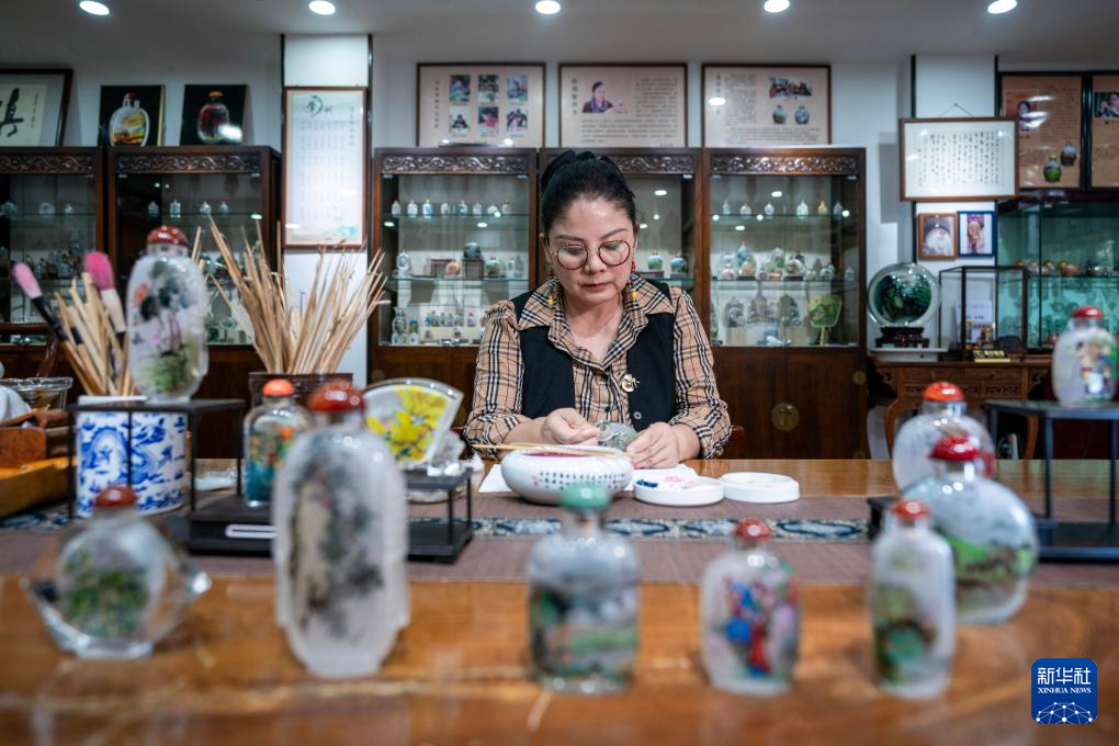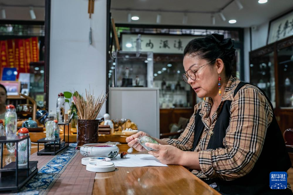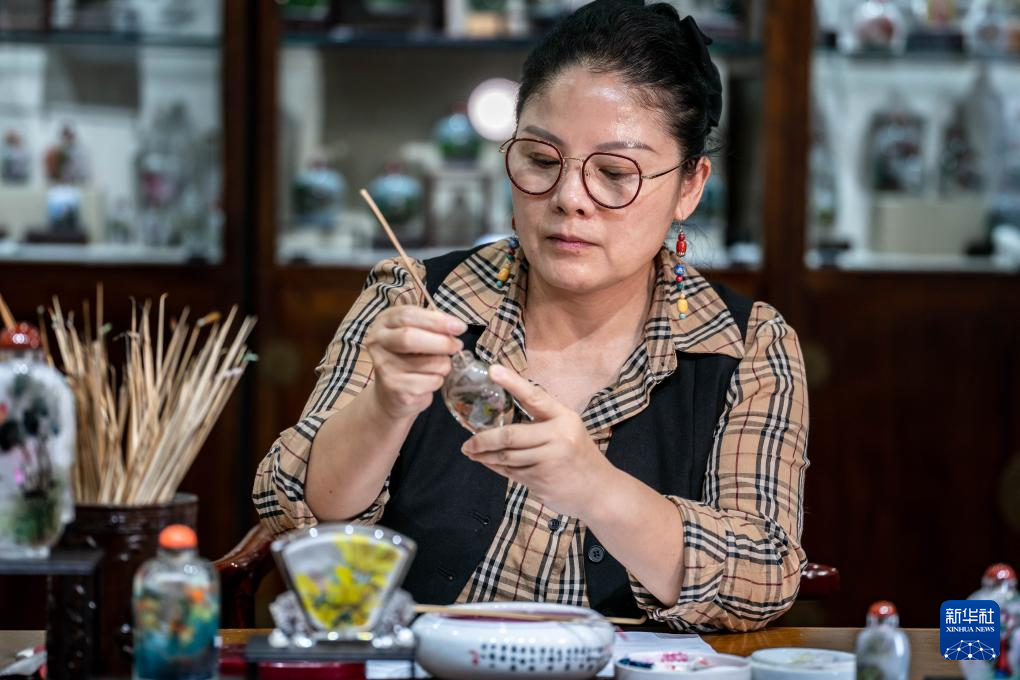 孫鴻雁在位于昆明官渡古鎮的滇派內畫傳習館內進行內畫創作(7月3日攝)。