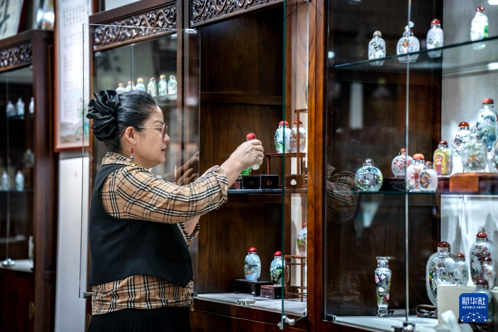 孫鴻雁在位于昆明官渡古鎮的滇派內畫傳習館內整理展柜里的內畫工藝品(7月3日攝)。