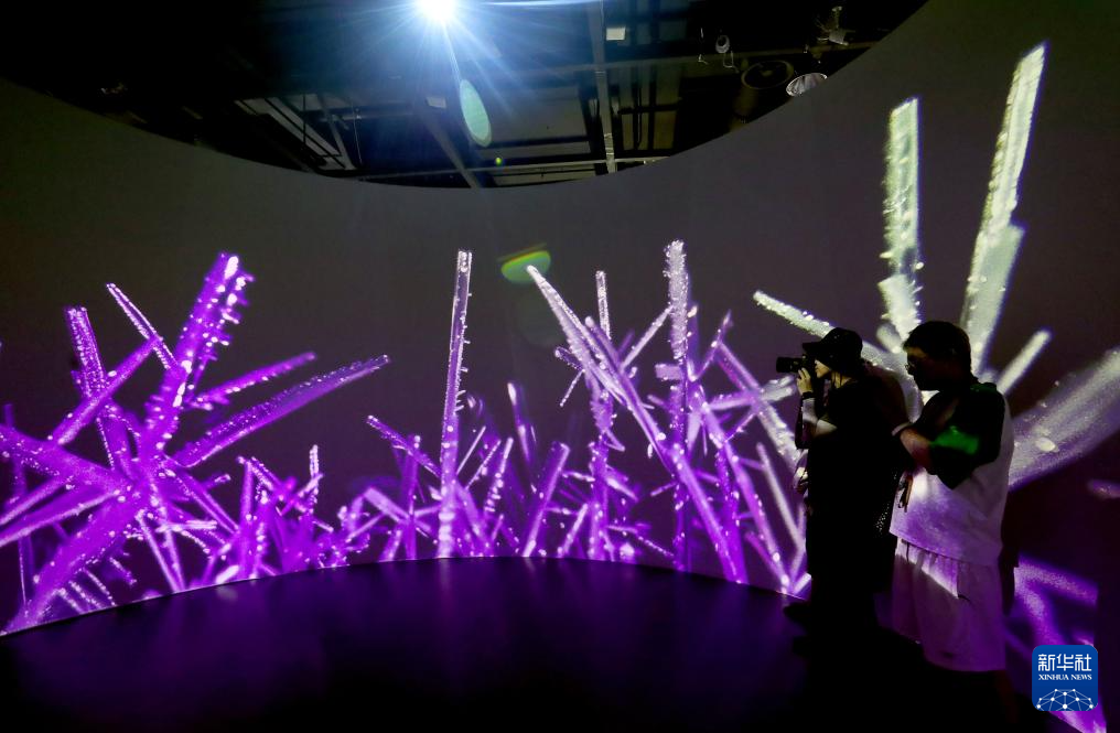 7月16日,參觀者在球幕前觀看展示水晶產生過程的影片。