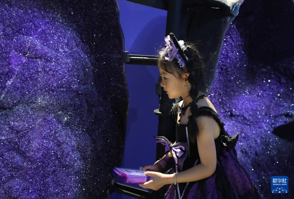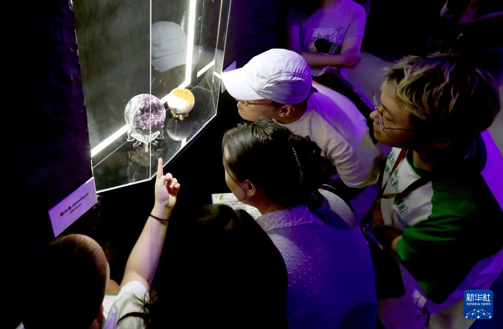 7月16日,參觀者在一組產自巴西的瑪瑙外殼紫水晶球體展品前駐足觀看。