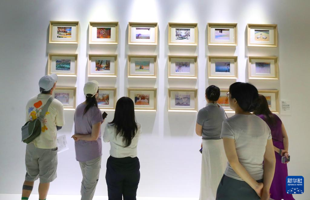 7月16日,參觀者在寶石畫藝術家劉全霞的作品墻前駐足觀看。