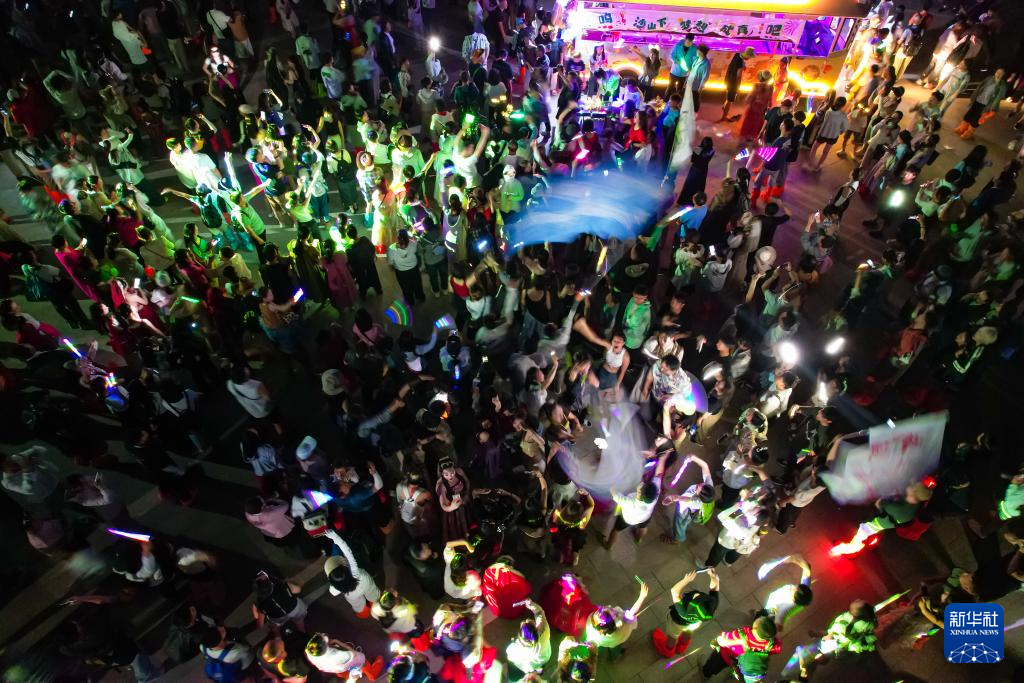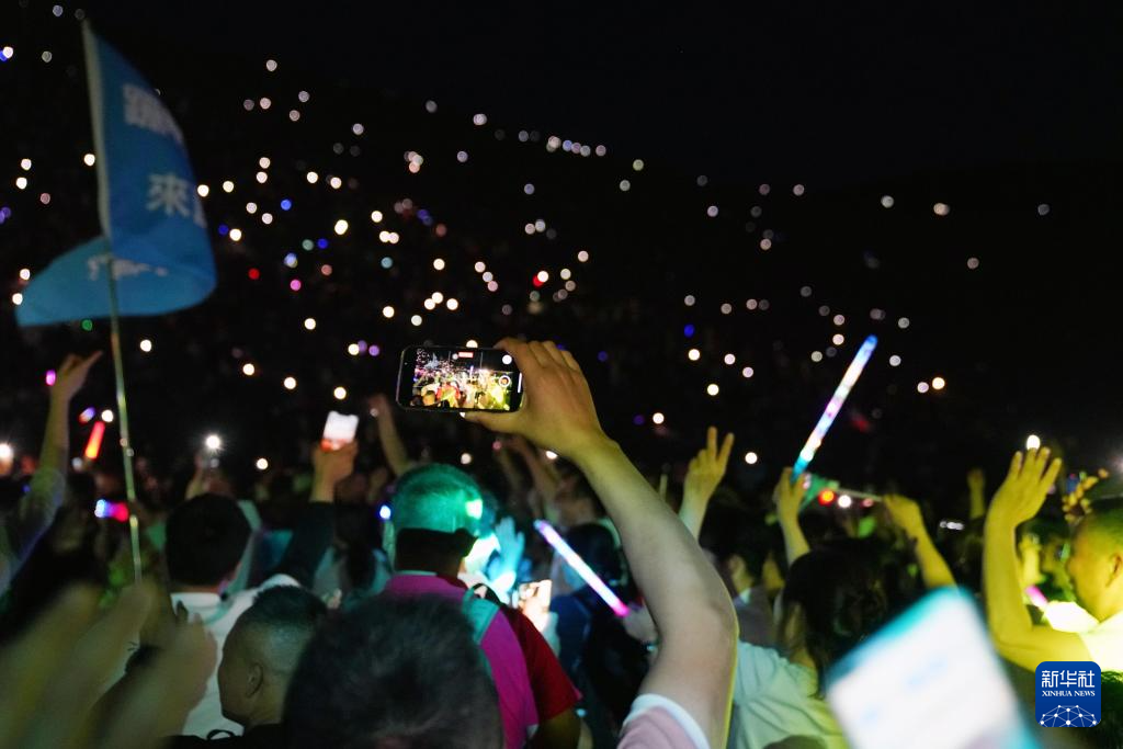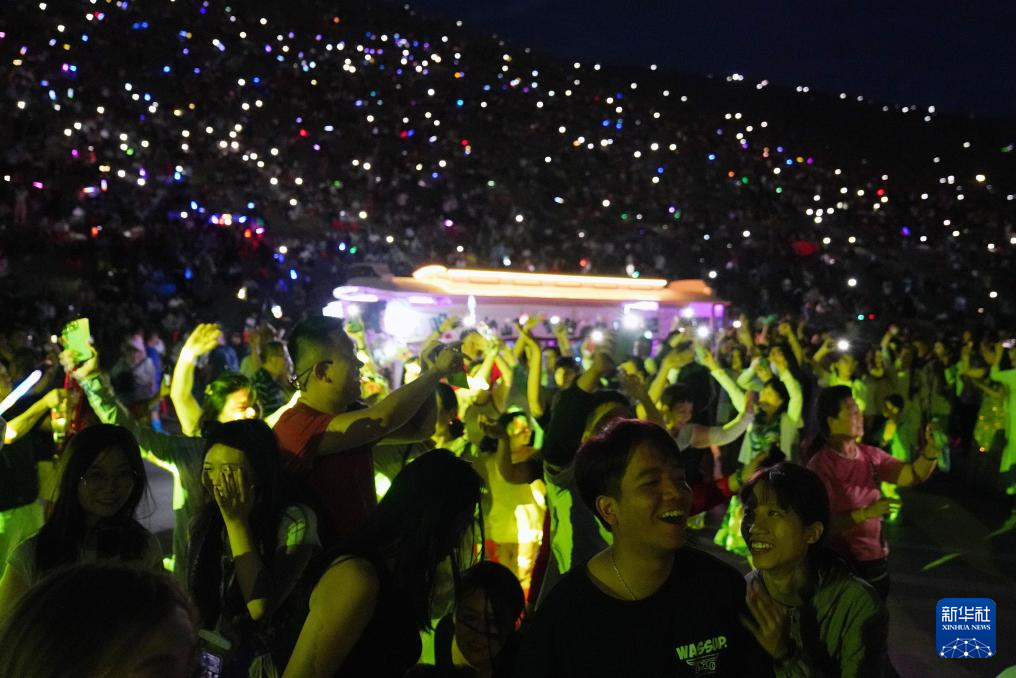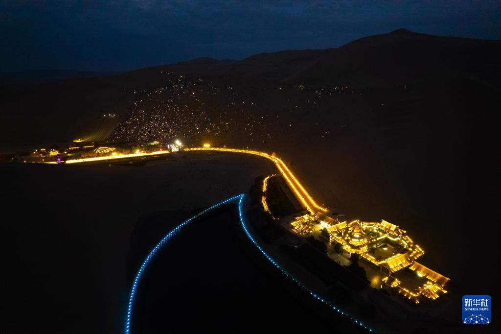 連日來,甘肅省敦煌市鳴沙山月牙泉景區2024年萬人星空演唱會持續火爆,吸引了大量游客前來體驗。每當夜幕降臨,演唱會啟幕,游客聚集在沙坡上跟隨音樂盡情歌唱,同時打開手機閃光燈,與月牙泉夜景交相輝映。