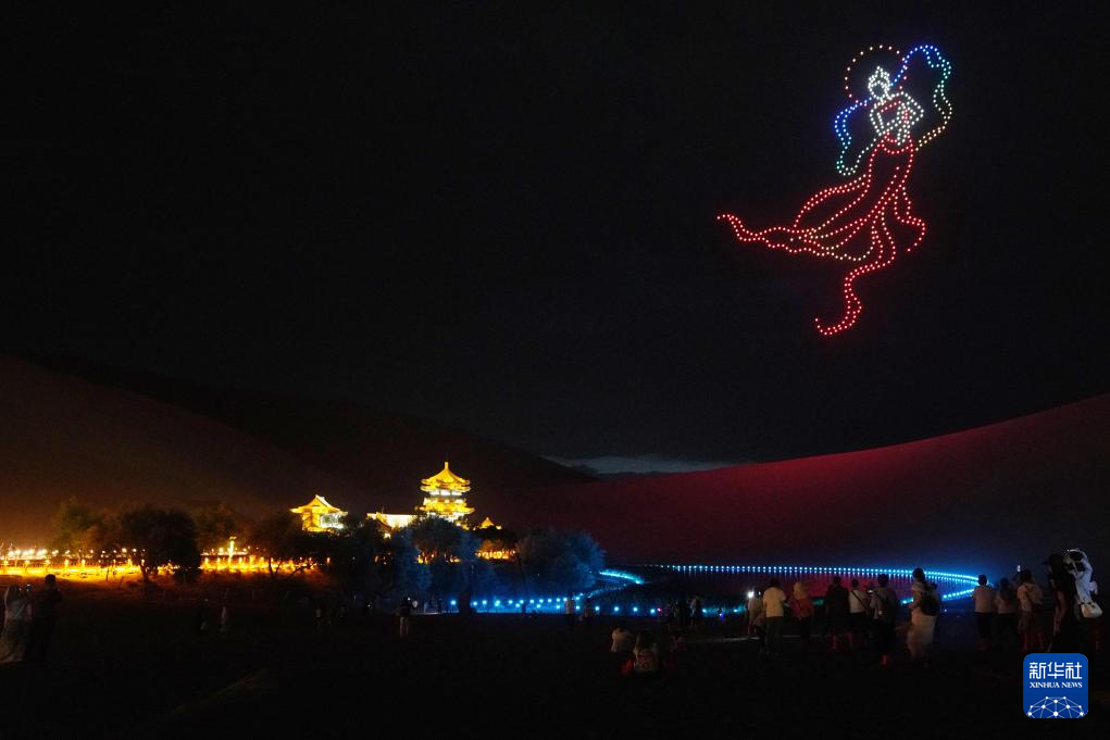 7月15日晚,游客在敦煌鳴沙山月牙泉景區觀看無人機燈光秀。