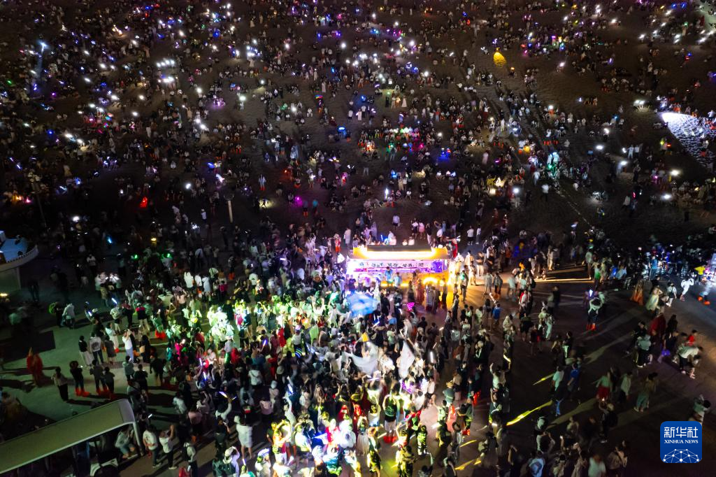 7月15日晚,游客在敦煌鳴沙山月牙泉景區參加萬人星空演唱會(無人機照片)。
