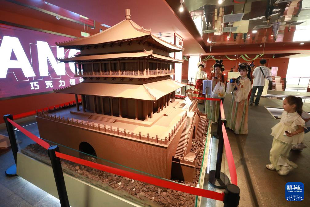 7月18日,游客在參觀用巧克力制作的“西安鐘樓”。
