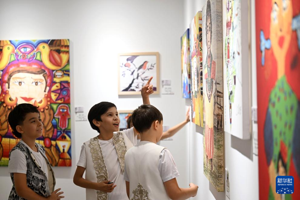 7月22日,烏茲別克斯坦托馬斯兒童音樂劇團成員在參觀藝術節期間舉辦的世界兒童繪畫展覽。