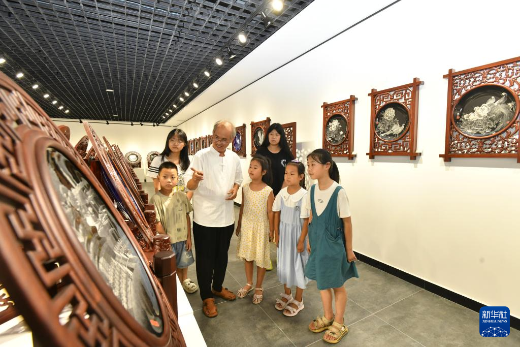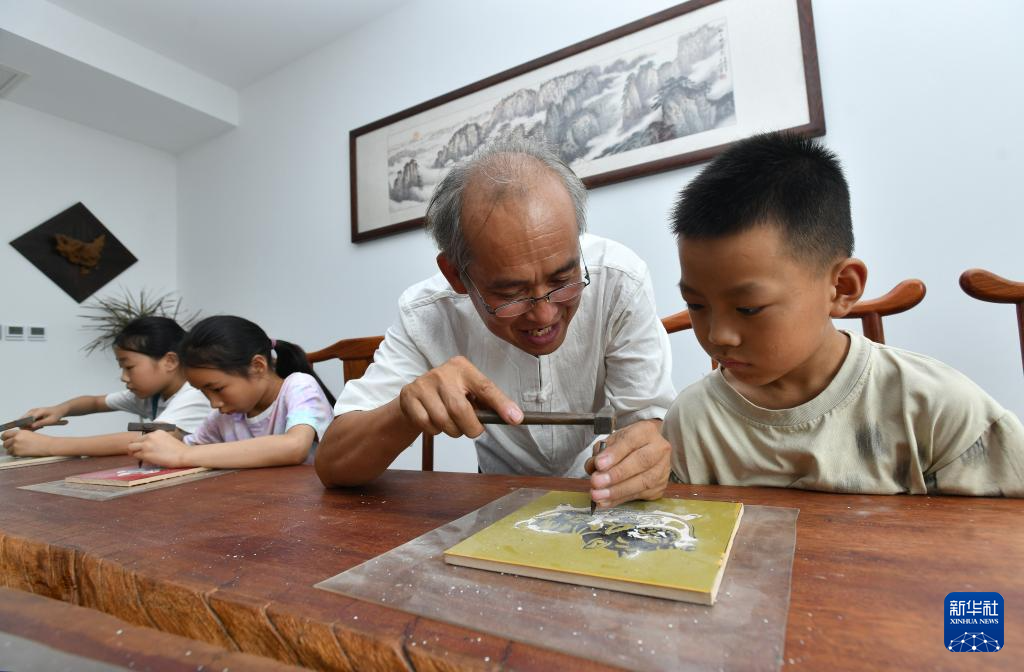 7月26日,在河間市刻瓷博物館,刻瓷藝人指導小學生學習刻瓷技藝。