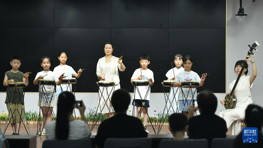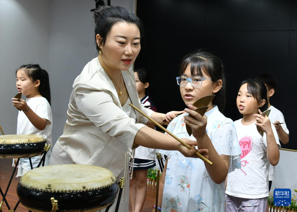 7月26日,在河間市第一實驗小學,西河大鼓藝人指導學生學習西河大鼓。