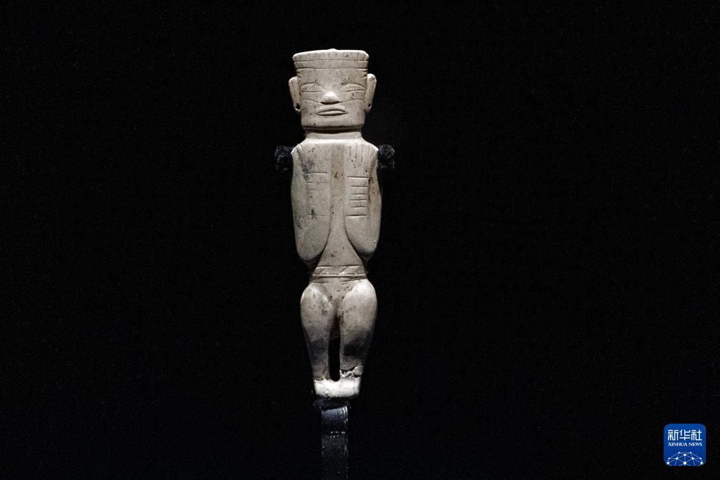 這是7月28日在重慶中國三峽博物館舉行的“玉出大江——長江流域史前玉器特展”上拍攝的凌家灘文化玉人。