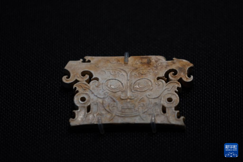 這是7月28日在重慶中國三峽博物館舉行的“玉出大江——長江流域史前玉器特展”上拍攝的肖家屋脊文化獠牙神面玉牌飾。