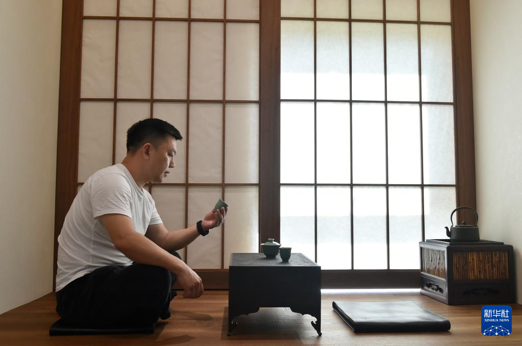 8月7日,“龍泉青瓷燒制技藝”代表性傳承人王武在位于浙江省龍泉市的“初青·王武”工作室查看作品。