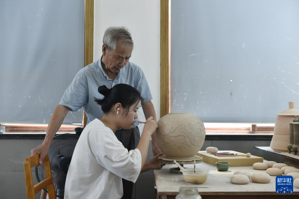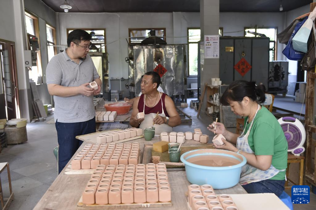 8月7日,在浙江省龍泉市的一家青瓷工作室,“龍泉青瓷燒制技藝”代表性傳承人陳壇根(后)在車間指導工人刻花。