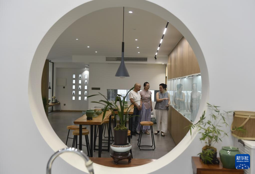 8月6日,在浙江省龍泉市小梅鎮大窯村的一家青瓷工作室,青瓷藝人羅詩彬(左二)向來訪者介紹自己的作品。