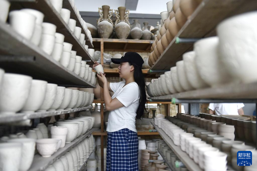 8月6日,在浙江省龍泉市一家青瓷工作室,青瓷藝人陳果檢查素坯質量。