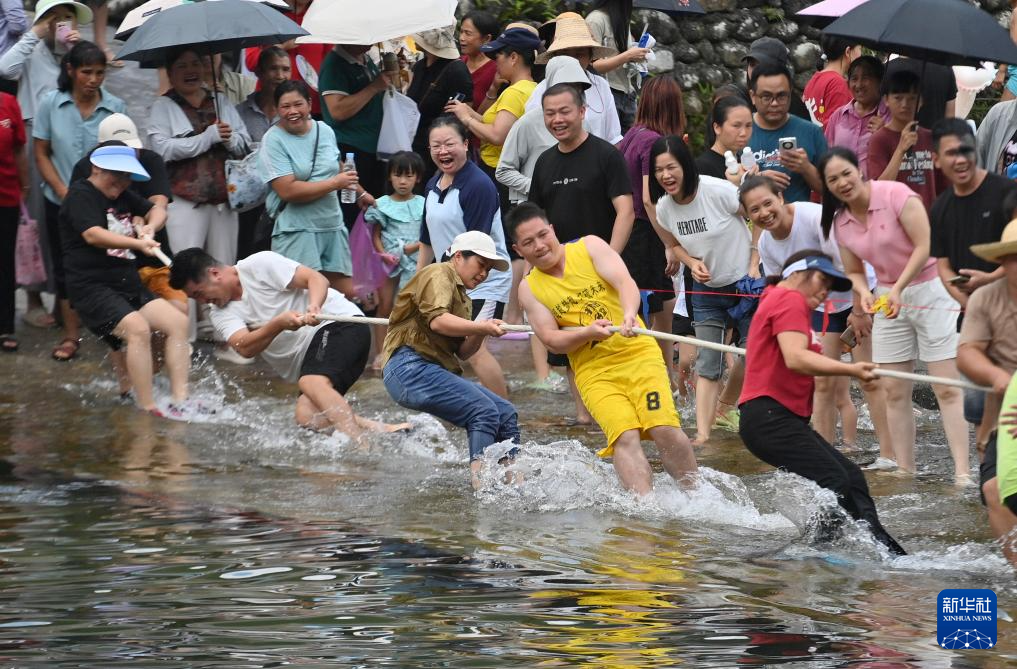 8月18日,在柳州市融水苗族自治縣汪洞鄉,村民們在改造后的河道上進行水上拔河比賽。