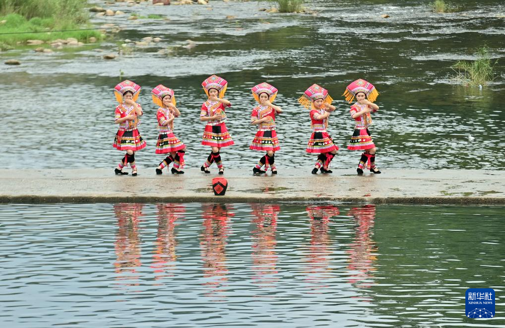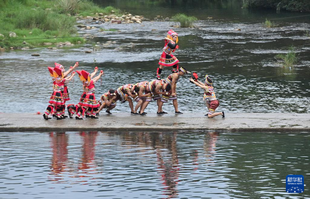 8月18日,在柳州市融水苗族自治縣汪洞鄉,村民們在改造后的河道上進行文藝表演。