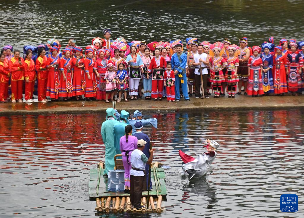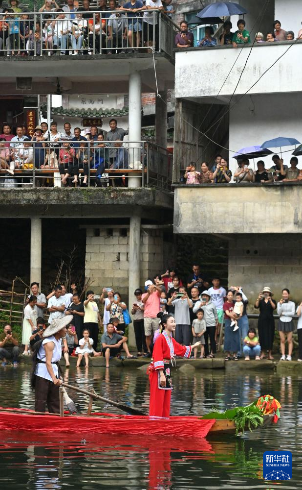 8月18日,在柳州市融水苗族自治縣汪洞鄉,村民們在改造后的河道上進行“劉三姐河上實景演出”。