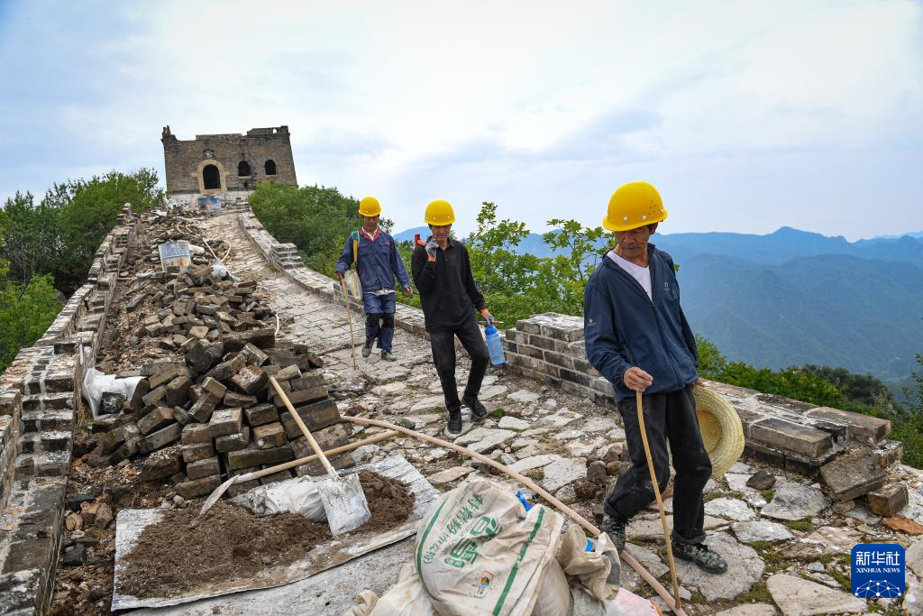 工人們走在箭扣長城122號敵臺東側墻體修繕施工現場(7月2日攝)。