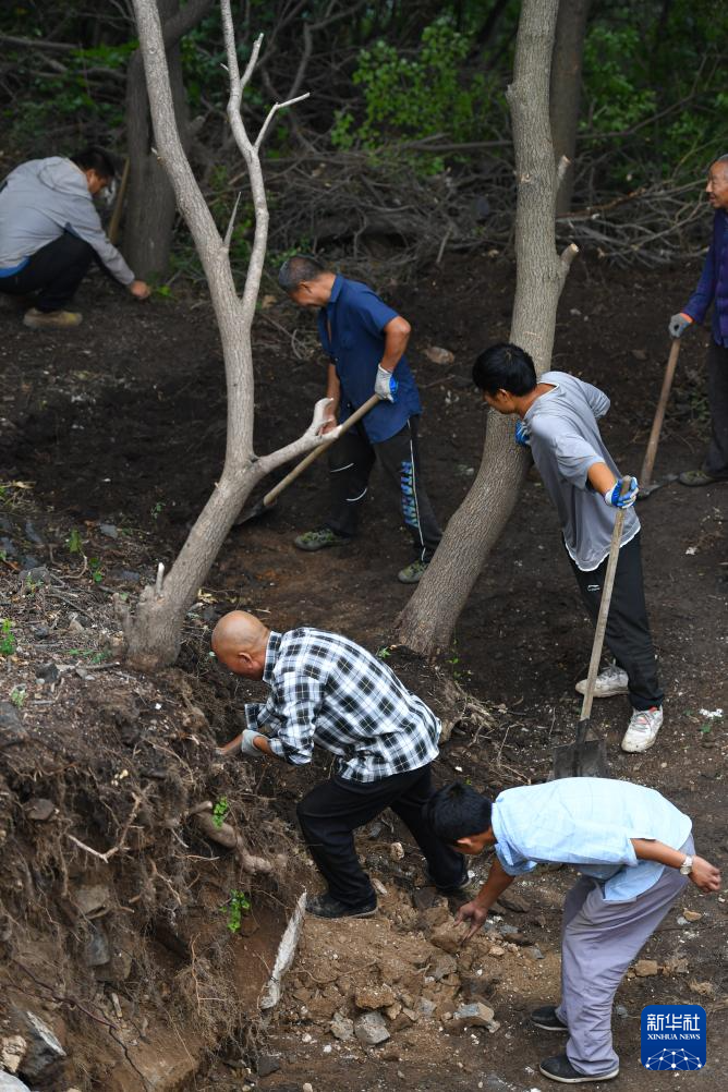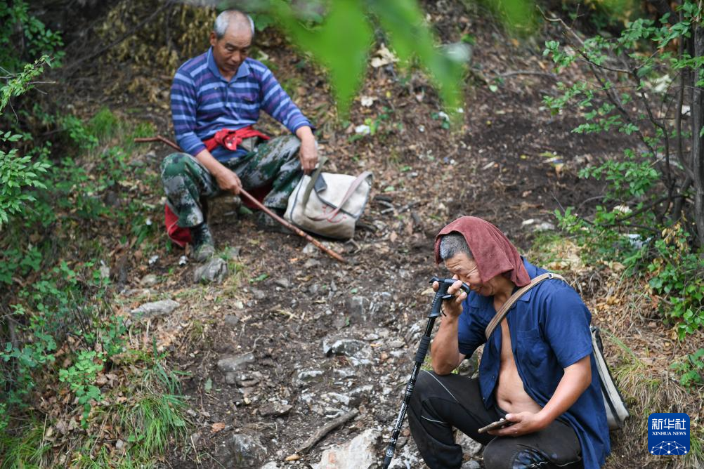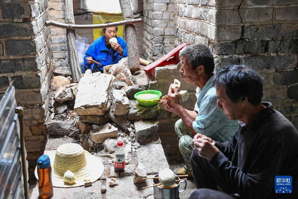 在箭扣長城122號敵臺東側墻體修繕施工現場,工人們結束上午的工作,準備離開去吃午飯(7月2日攝)。