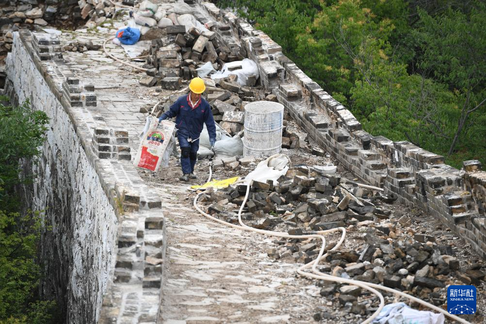 工人在箭扣長城122號敵臺東側墻體修繕施工現場(7月2日攝)。