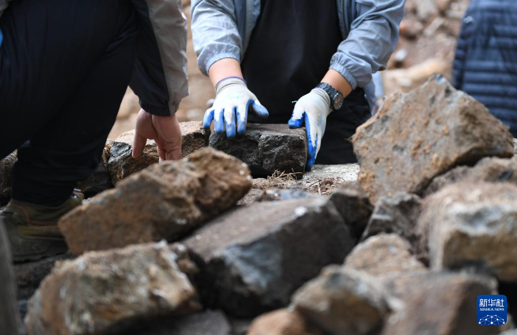 工人在整理從箭扣長城120號敵臺考古現場挖出的磚塊(7月2日攝)。