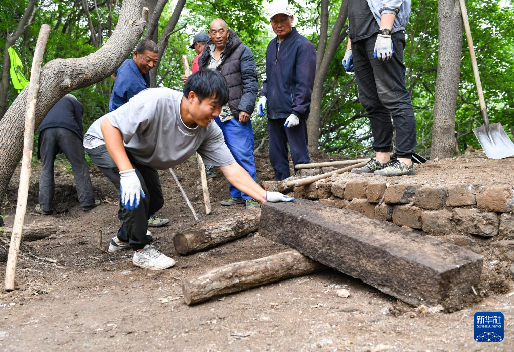 在箭扣長城120號敵臺考古現場,工人們利用撬棍、滾木運輸一塊挖出的條石(7月2日攝)。
