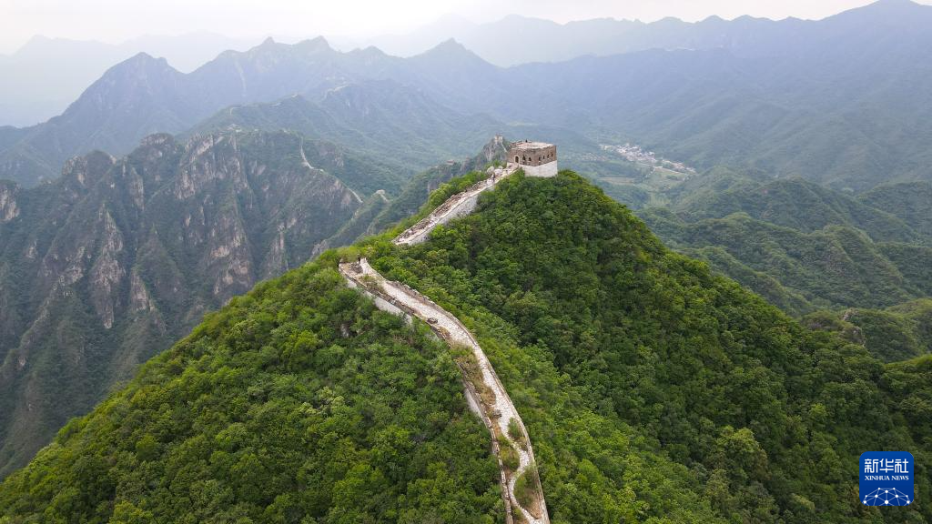 這是箭扣長城122號敵臺東側墻體修繕施工段(7月1日攝,無人機照片)。
