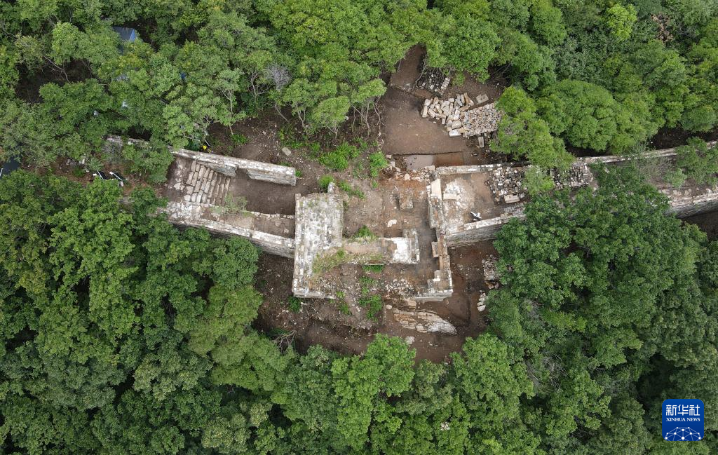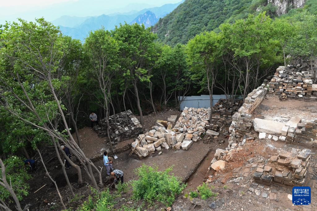 這是箭扣長城120號敵臺考古現場(7月1日攝,無人機照片)。