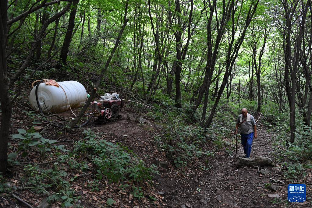 工人在前往箭扣長城考古工地途中經過一處水泵設施(7月2日攝)。水泵將山下的水運輸至施工現場,用來制作灰漿等施工材料。
