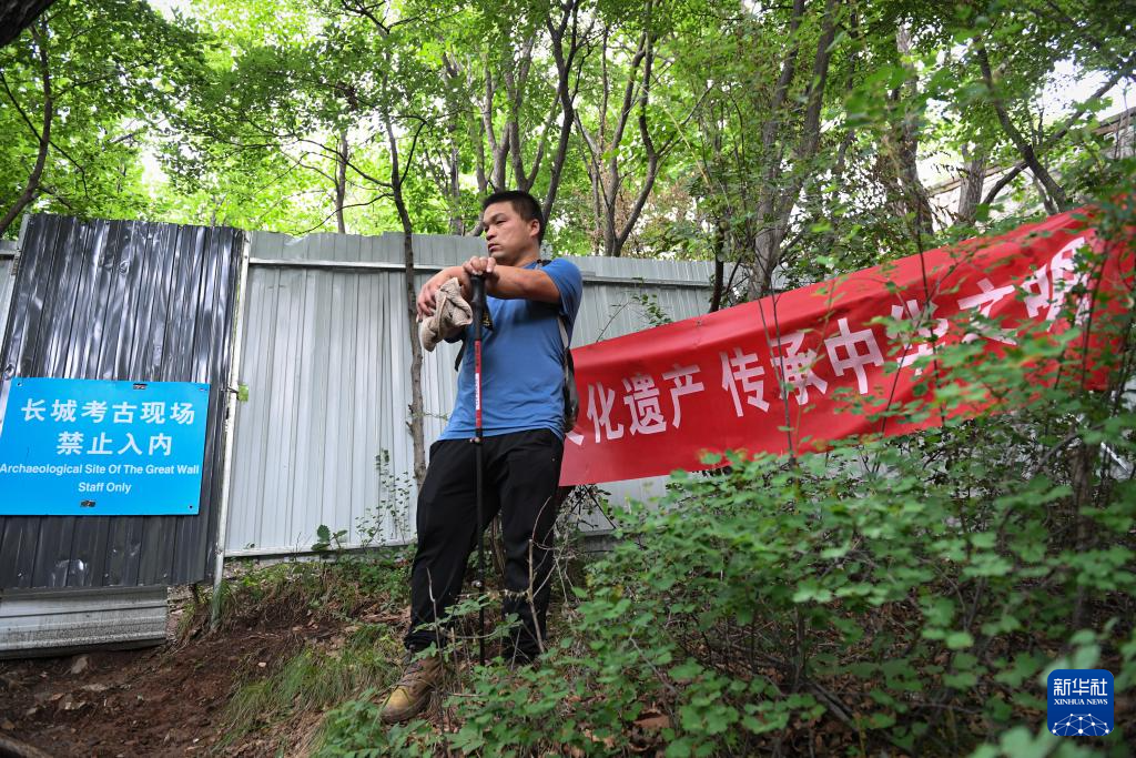 負責考古現場的技工楊戰杰抵達箭扣長城考古現場,等待保安開門(7月2日攝)。