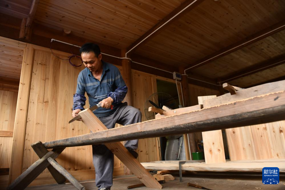 在融水苗族自治縣桿洞鄉堯告村,木工師傅楊正榮在加工用于裝修木樓的木材(8月14日攝)。