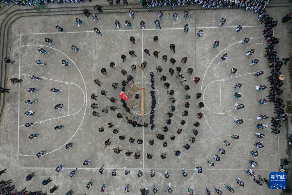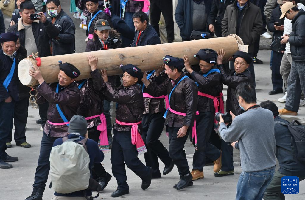 在融水苗族自治縣桿洞鄉堯告村,村民在拉鼓祈福(無人機照片,2022年12月7日攝)。