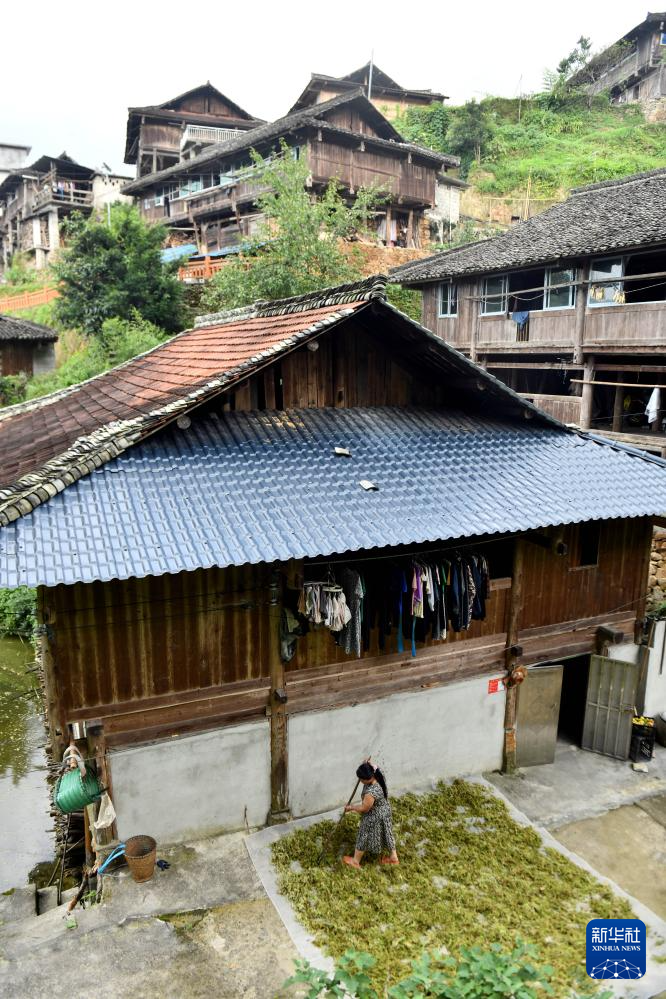 在融水苗族自治縣桿洞鄉堯告村,村民在晾曬中草藥(8月14日攝)。