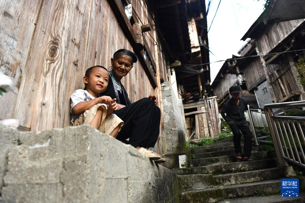 在融水苗族自治縣桿洞鄉堯告村,75歲的梁妹略老人和孫子坐在路旁休息(8月13日攝)。