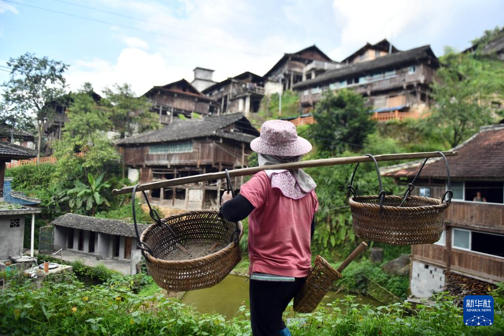 在融水苗族自治縣桿洞鄉堯告村,村民韋祥媽上山勞作(8月14日攝)。