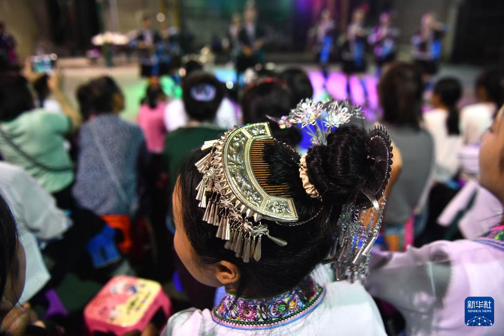 在融水苗族自治縣桿洞鄉堯告村,頭戴精美銀飾的苗族姑娘在觀看文藝演出(8月13日攝)。