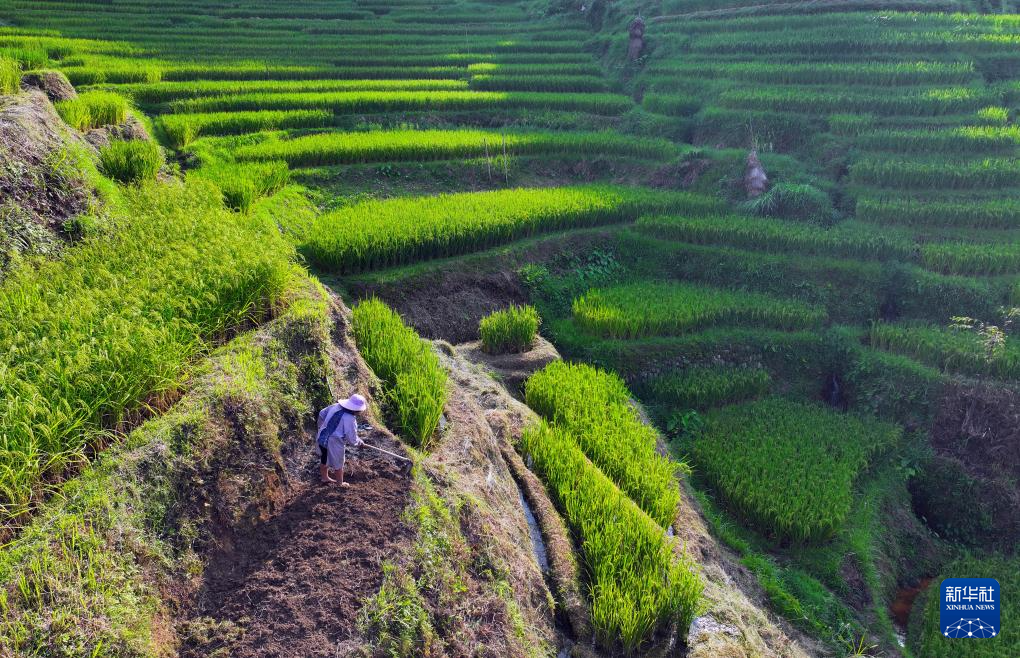 在融水苗族自治縣桿洞鄉堯告村,村民在稻田里勞作(無人機照片,8月15日攝)。
