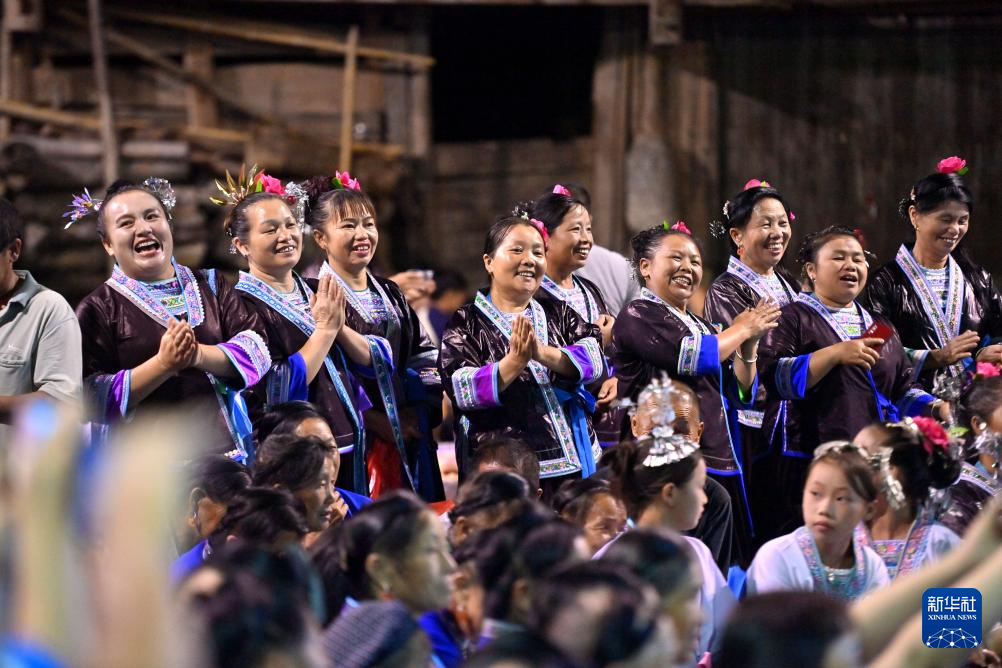 在融水苗族自治縣桿洞鄉堯告村,村民們在觀看文藝演出(8月13日攝)。