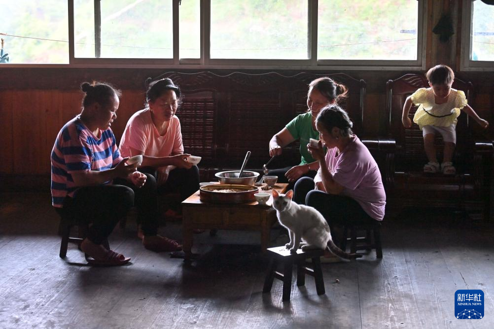 在融水苗族自治縣桿洞鄉堯告村,村民們在喝油茶(8月14日攝)。