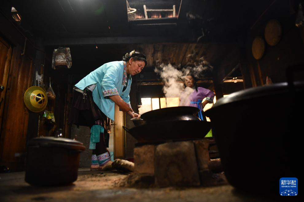 在融水苗族自治縣桿洞鄉堯告村,村民在家里做飯(8月13日攝)。